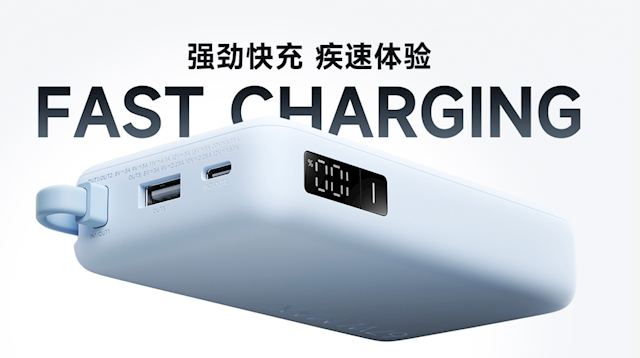 设计上,充电宝自带USB-C充电线,配备收纳槽可作挂绳,线材经5000次摇摆测试耐用性强。